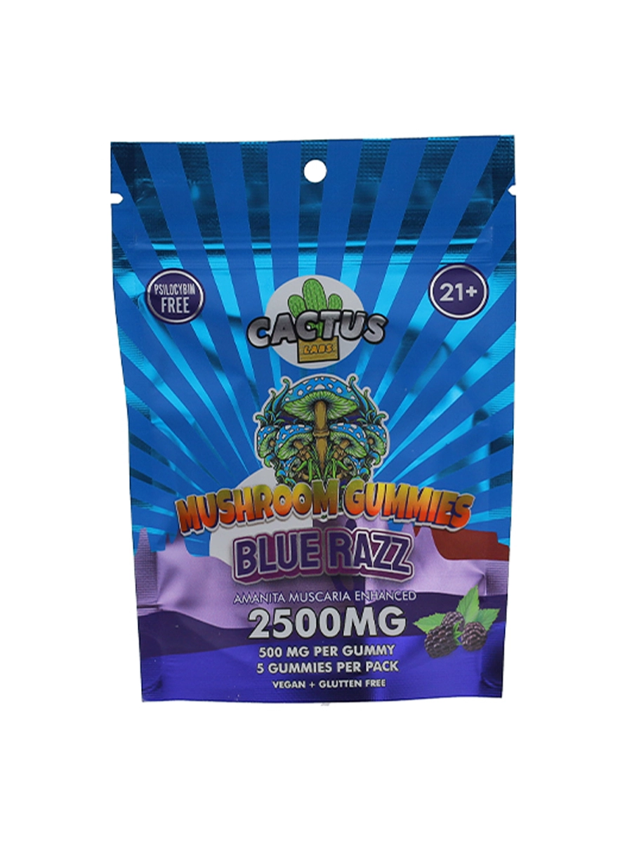 Each gummy in Blue Razz Cactus Labs Amanita Muscara Mushroom Gummies 2500mg delivers 500mg of active alkaloids and a 2:1:1 ratio of Muscimol, Muscarine, and Ibotenic Acid. This makes them the most potent Amanita product on the market.