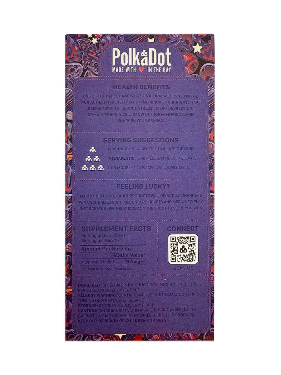 Buy Caramel Peanut Swirl PolkaDot Milk Chocolate now at Eat Mushroom Chocolate for a rich, nutty delight.