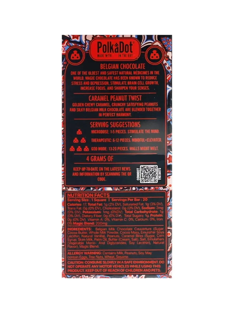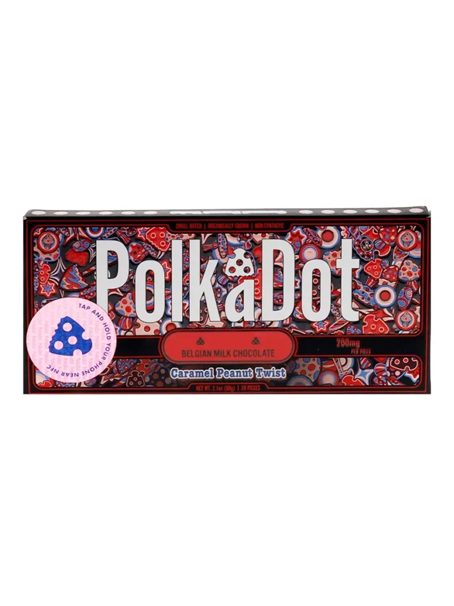 Treat your taste buds to a delectable fusion of flavors with Caramel Peanut Twist PolkaDot Mushroom Belgian Milk Chocolate 200mg Per Piece. Smooth Belgian milk chocolate meets crunchy peanuts and creamy caramel, creating a tantalizing balance of sweet and savory notes. Each bite offers a delightful twist on a classic favorite, delivering a satisfyingly indulgent experience. Infused with 200mg of mushrooms, it’s perfect for any chocolate lover.
