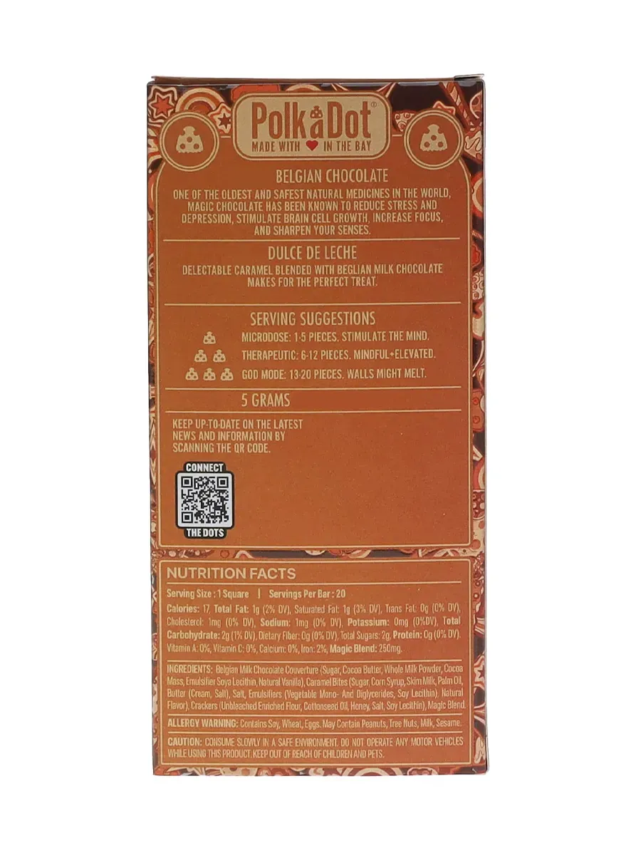 Sweet, creamy, and indulgent, Dulce De Leche PolkaDot Mushroom Belgian Milk Chocolate 250mg delivers a caramel lover’s dream. The silky Belgian milk chocolate is enriched with the richness of dulce de leche, creating a buttery, caramelized delight in every bite. Infused with premium mushrooms, this treat offers a smooth, uplifting experience that pairs beautifully with the melt-in-your-mouth texture. Whether you’re microdosing or indulging, this is the ultimate sweet and euphoric chocolate experience.