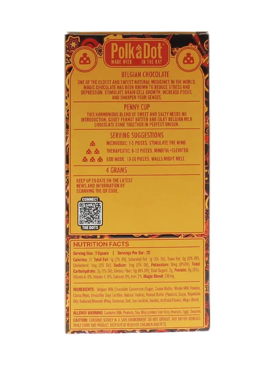 Experience the Penny Cup PolkaDot Mushroom Belgian White Chocolate, a decadent blend of creamy Belgian white chocolate and the aromatic essence of penny cup mushrooms. Infused with 200mg of mushrooms per piece, this exquisite treat offers a harmonious mix of flavor and enchantment. Perfect for those seeking a unique and fascinating indulgence, each bite promises to enhance your senses and create an unforgettable trip of delight and wonder.