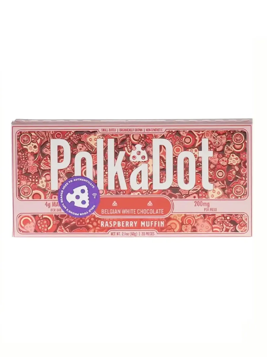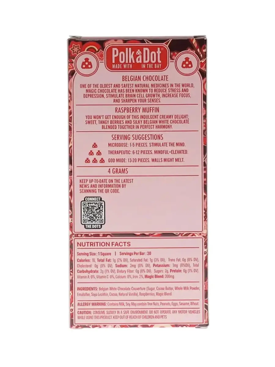 Experience the Raspberry Muffin PolkaDot Mushroom Belgian White Chocolate, a delightful fusion of creamy Belgian white chocolate, sweet raspberries, and soft muffin bits. Infused with 200mg of mushrooms per piece, this indulgent treat offers a unique and enchanting experience. Perfectly balancing fruity sweetness with rich chocolate flavors, it promises to enhance your senses and transform every bite into a fascinating trip of taste and wonder.