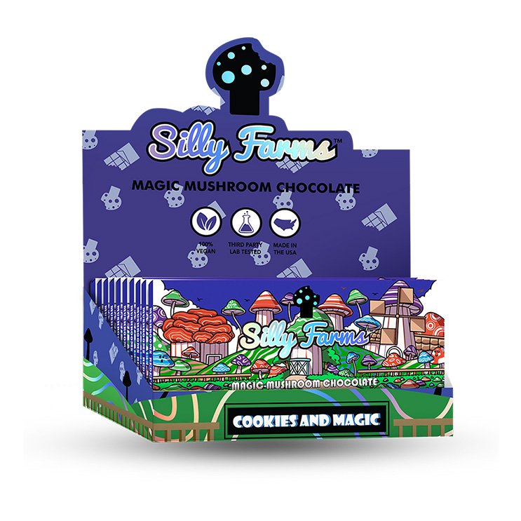 Silly Farms is proud to unveil Cookies and Magic, a gourmet chocolate bar inspired by the iconic taste of Oreo cookies. This unique offering melds the beloved contrast of rich, creamy filling and dark, crunchy cookies with the enchanting properties of Amanita Muscaria, delivering an experience that’s both nostalgically familiar and thrillingly novel.