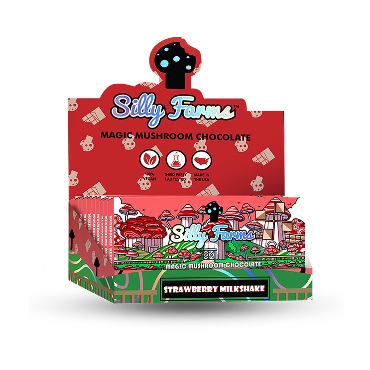 Silly Farms proudly presents STRAWBERRY MILKSHAKE, a luxurious chocolate homage to the quintessential strawberry milkshake. This exquisite confection melds the sweet, vibrant essence of fresh strawberries with the smooth, rich allure of milk chocolate, all enhanced by the mystical addition of Amanita Muscaria Muscimol extract.