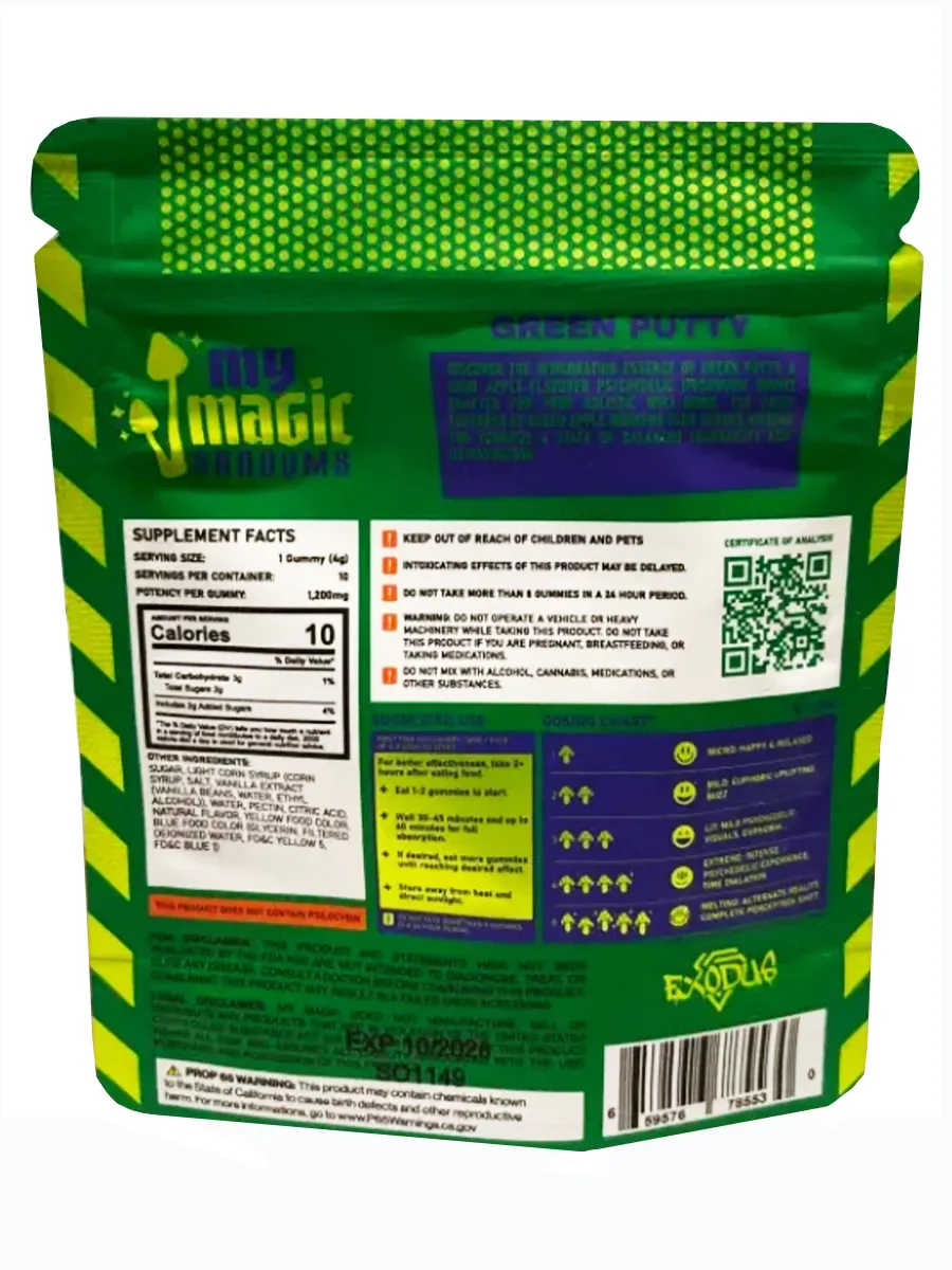 Order your Sour Apple Green Putty Exodus My Shroom Mushy Gummies 10pcs 40G and treat yourself to a sour and satisfying adventure.