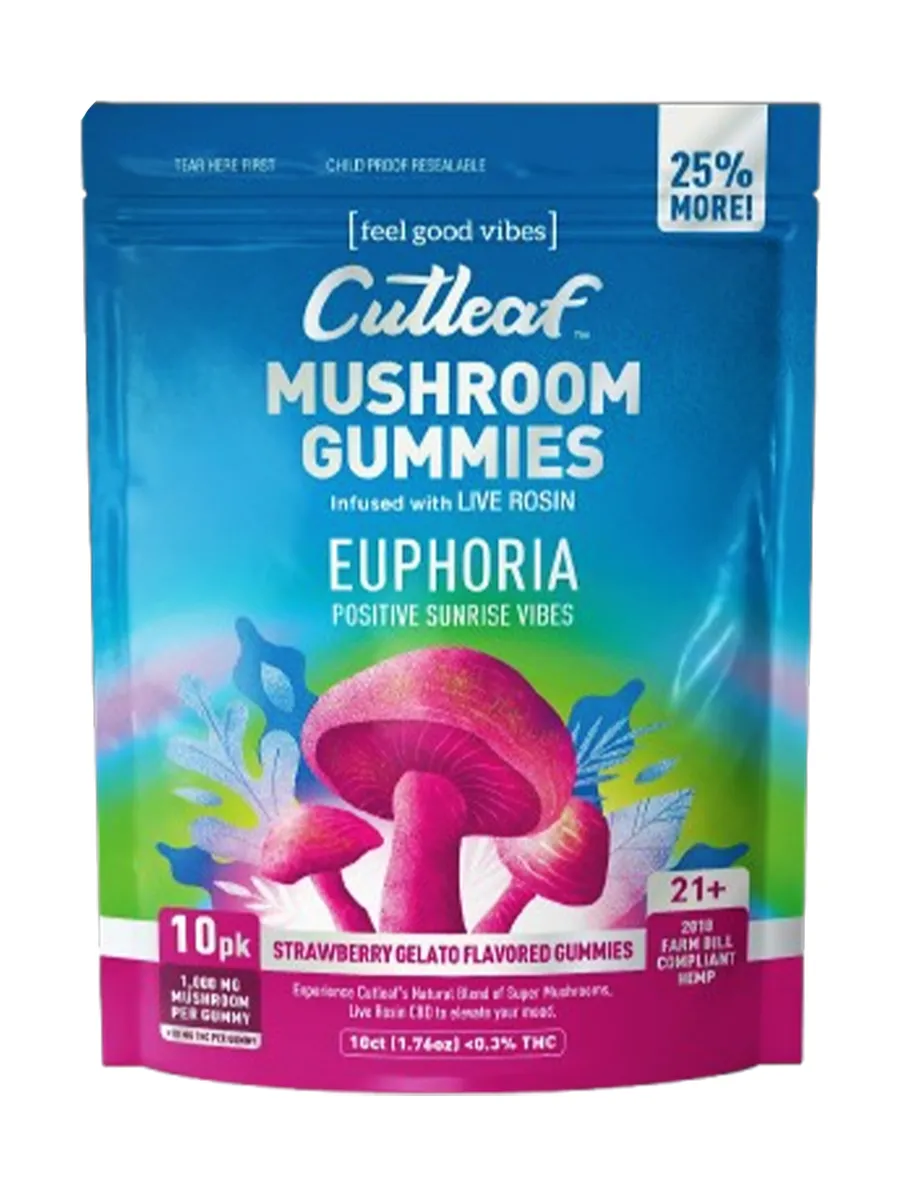 Savor the sweet and creamy goodness of the Strawberry Gelato Cutleaf Euphoria Mushroom Gummies 1000mg 10ct.