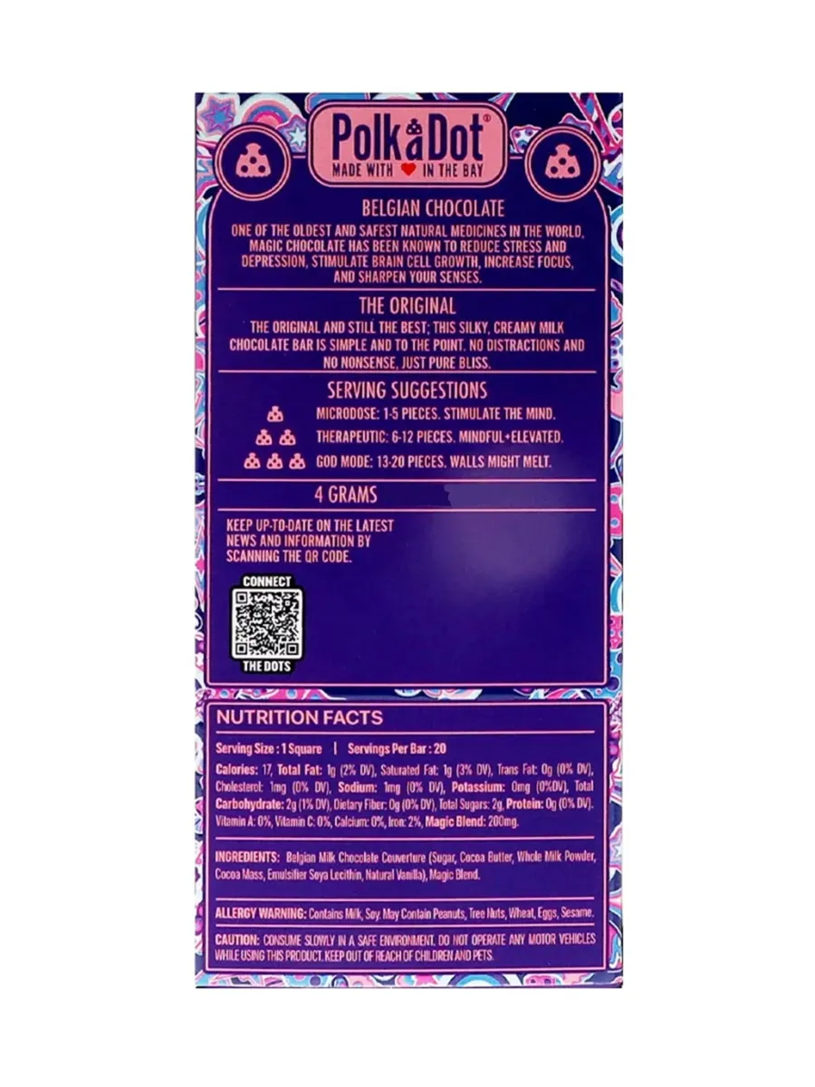 Savor the The Original PolkaDot Mushroom Belgian Milk Chocolate, a luxurious treat infused with 200mg of mushrooms per piece. Made with premium Belgian milk chocolate, each bite offers a rich, creamy flavor paired with the mystical essence of mushrooms. Perfect for those seeking a unique and euphoric experience, this enchanting chocolate invites you to enhance your senses and indulge in a delicious voyage of enchantment.