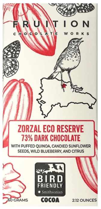 Zorzal Eco-Reserve 73% Dark Bar – Fruition. Not every dark chocolate bar can claim the same pedigree—let’s be clear about that. Fruition’s Zorzal Eco-Reserve 73% Dark Bar sets itself apart, both in flavor and in purpose. This product is crafted using fine cacao sourced directly from the Zorzal Reserve, the Dominican Republic’s pioneering private wildlife sanctuary.